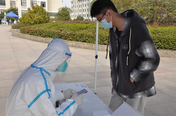 学校严格按照相关要求,从严从紧、从实从细落实各项措施,在校内设置采样点4处,按学院、专业顺序分批次、错峰进行采样。学校各部门科学分工、各司其职、通力合作。接到核算采样检测任务后,广大党员冲锋在前开展志愿服务工作,学生志愿者紧急支援,现场筑起“青春防线”。现场志愿者采取轮班制,坚守在现场的每一个岗位上,进行着秩序维护、采集引导、身份信息采集、分贴核酸检测条码等工作,医务人员守护“疫”线,一丝不苟地为师生和工作人员进行采样,全员的共同努力使检测工作高效有序地进行。