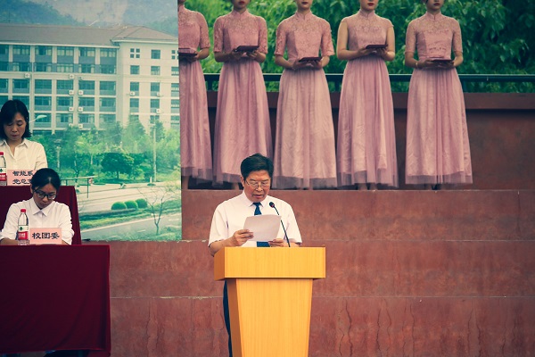 在庄严雄壮的国歌声中,典礼拉开帷幕。杜宝山宣读国家奖学金、省政府奖学金、省级优秀毕业生以及院级优秀毕业生表彰文件,他希望受表彰的同学们继续示范引领,以优秀的品德感染人,以优异的业绩鼓舞人,勇做走在时代前列的奋进者、开拓者、奉献者。随后,校领导向获得荣誉的同学们颁发了荣誉证书。