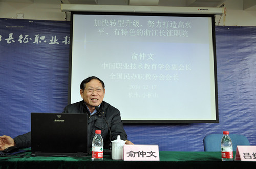 12月17日下午,中国职业技术教育学会副会长、民办分会会长俞仲文莅临我院,并作了题为《加快转型升级,努力打造高水平、有特色的浙江长征职院》的报告。学院领导、全体教师和辅导员参加,执行院长吕振合教授主持了报告会。