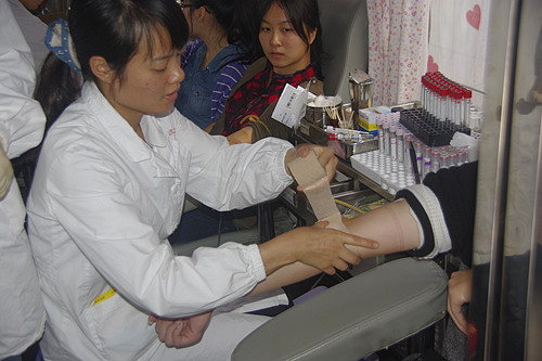 上午10点,献血车刚停驻于图书馆前,就吸引了不少同学前来报名咨询。我院学生积极性很高,纷纷围着咨询点咨询自己的健康状况能否献血。血液中心的医生耐心地为同学们一一解答,合理的献血有助于身体健康,既回报社会,又传递爱心。献血车前很快排起了长队,有填写献血表的,有抽血等待化验报告的。被采访的同学表示第一次献血会有点紧张,但想到能为病患奉献一份爱心,还是很乐意的。献血现场人群涌动,填表、体检、化验、等候、抽血、休息,所有到流程都井然有序地开展着。截止到下午6点,此次无偿献血活动人数达235人,献血总量为58760毫升。