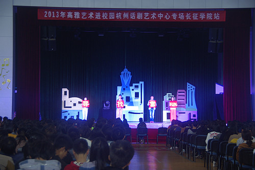 2013年11月13日下午两点,来自杭州话剧团的年轻演员们在我院体育馆为同学们精彩演绎了话剧《寻找雷FUN》,我院1200余名师生观看了本场表演。