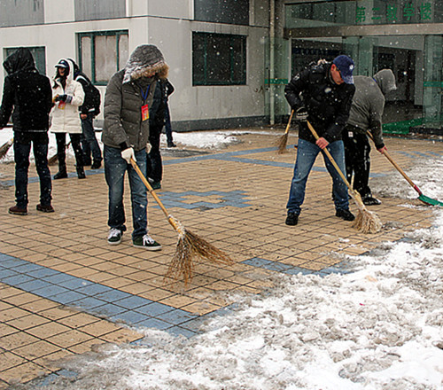 为了恢复大家正常的校园生活,防止因雪天路滑带来的不便,我校“一体两翼”学生干部及各系学生干部,分别在行政楼、1号教学楼、2号教学楼,实训楼等大家经常出入的场所进行了扫雪、铲雪活动。大家拿着铲雪的工具展开了此次活动,虽然积雪很厚,但是大家干劲十足,铲的铲、扫的扫,丝毫没有停下休息的意思,惟恐自己落后他人。大家三五成群,各自负责一块地面,热火朝天的忙活起来。在大家的共同努力下,终于为同学们开辟出了一条条露出本色的小路,每个人脸上都露出了欣慰的笑容,过往同学也投以感激的微笑。