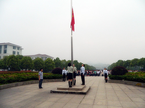 在初夏的早晨,同学们怀着崇高的敬意参加升旗仪式。七点整,七名国旗手身著笔挺的军装,迈着坚定地步伐,“出旗、立正、敬礼、升旗”国旗手把国旗向空中扬起。伴随着国旗缓缓上升,众人的视线也定格在国旗升旗的那一刻。全体同学在庄严肃穆的气氛中共同回忆历史,缅怀先辈。全体同学高昂的唱响义勇军进行曲,爱国精神在校园内回荡不绝。学生代表国旗下讲话。团委书记陶元发表演讲,她告诫同学们要传承历史,学习五四精神。并对同学们平时对爱国情意淡薄的行为做出批评。