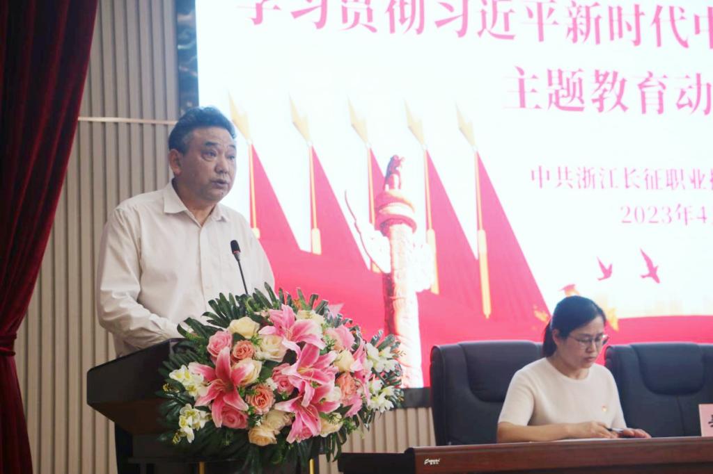 学校党委副书记、纪委书记张乐弟围绕《中共浙江长征职业技术学院委员会关于深入开展学习贯彻习近平新时代中国特色社会主义思想主题教育的工作方案》,对学校推动主题教育活动走深走实作出具体部署。《工作方案》明确提出,学校主题教育在学校党委领导下开展,以中层以上领导干部为重点,从 2023年4月开始,8月基本结束,不划阶段、不分环节,把理论学习、调查研究、推动发展、检视整改贯通起来,有机融合、一体推进。学校成立学习贯彻习近平新时代中国特色社会主义思想主题教育领导小组,下设办公室。各级党组织要高度重视、精心组织,成立相应领导机构和工作机构,党组织主要负责同志要履行第一责任人职责,班子成员落实“一岗双责”,对分管领域加强指导督查。各单位要坚持围绕中心、服务大局,把开展主题教育同贯彻落实党中央决策部署和市委工作要求结合起来,同推动中心工作结合起来,同推进机构改革结合起来,防止“两张皮”,做到两手抓、两促进。