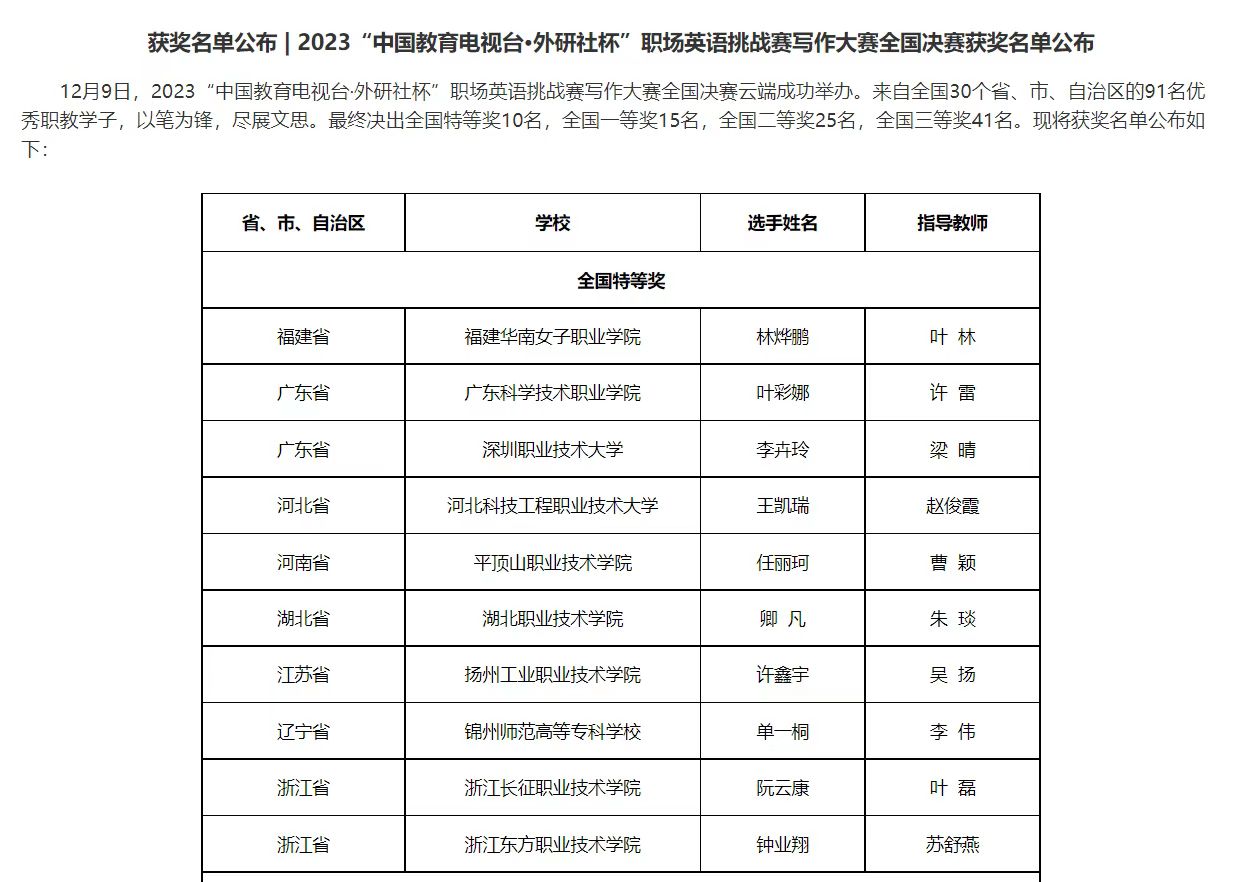 喜报|我校学子荣获2023“中国教育电视台•外研社杯”职场英语挑战赛 写作大赛全国决赛特等奖