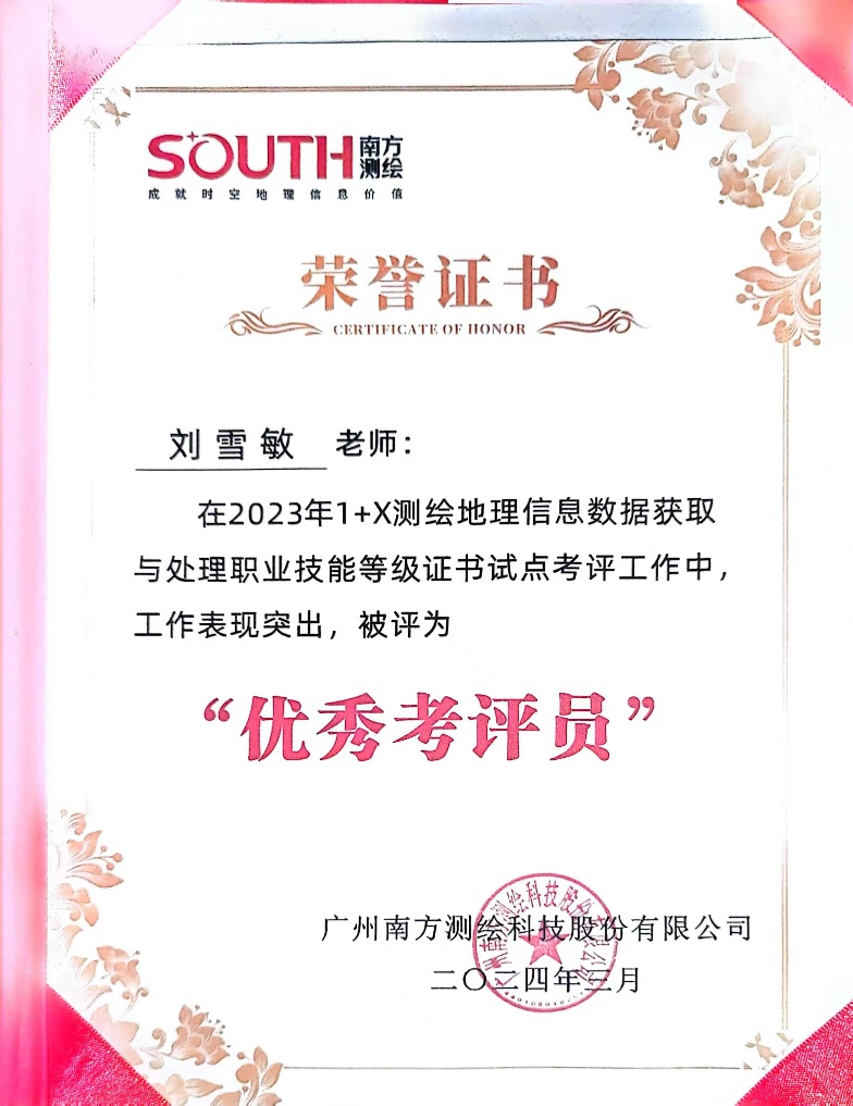 近日,2023年度全国 “1+X”证书优秀考核站点及优秀考评员表彰会议在杭州举办,我校荣获2023年度“1+X测绘地理信息数据获取与处理”职业技能等级证书“优秀考核站点”称号,建筑工程学院刘雪敏老师获得2023年度“优秀考评员”荣誉。
