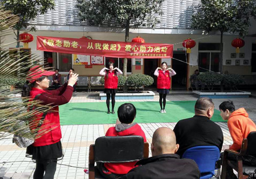 经过将近两小时的车程,应用语言系的志愿者们终于到达了目的地。节目彩排、音响调配、与工作人员协调现场安排等等,一切都在有条不紊的进行着。在明媚的阳光中,在志愿者的忙碌中节目正式拉开了序幕。首先是由苏曦冉同学和郑孜宇同学为大家带来的诗歌朗诵。伴随着感人的背景音乐,一个个真诚而有分量的字眼浮现在大家面前。“孩子所以请你紧紧地握着我的手,陪着我,慢慢地,就像当年一样,我带着你一步一步地走。”这首诗朗诵让现场的志愿者们感受到,人要心存感恩,有时候我们需要花更多的时间和耐心去陪伴我们所爱的人。紧接着是由沈秀男同学和孙佳欣同学为老人们带来的独具特色的双人舞《掀起你的盖头来》,欢快的音乐、动人的舞姿一下子将现场的气氛调动到了最高潮,老人们脸上纷纷露出了笑容。美好的时光总是显得特别的短暂,最后一个节目是由15商英1班的胡静芝同学带来的独唱《我只在乎你》,在扣人心弦的旋律中,她为大家娓娓道来的是“任时光匆匆流去,我只在乎你。”无论岁月在你们身上留下了怎样的痕迹,我们对你们的爱是永远不会被时间所磨灭的。