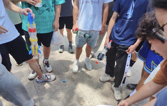 本次比赛要求同学们事先准备好废旧碳酸饮料瓶等材料自己动手亲身创作水火箭,制作原理与真实火箭相同,都是利用反冲原理推动火箭发射。比赛采用线下实时竞赛形式,对参赛选手实践创造能力,现场稳定能力等多方面综合水平进行考察。比赛现场,工作人员有序组织,将记录、测量、监督等工作落实到位,分工明确有条不紊,确保了活动的顺利举办。参赛的同学将精心制作好的水火箭按照安全操作的指引和要求进行发射,场面十分欢乐。