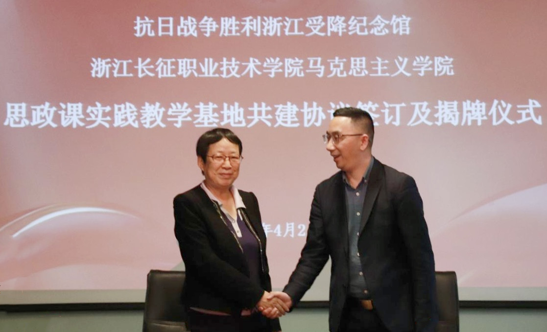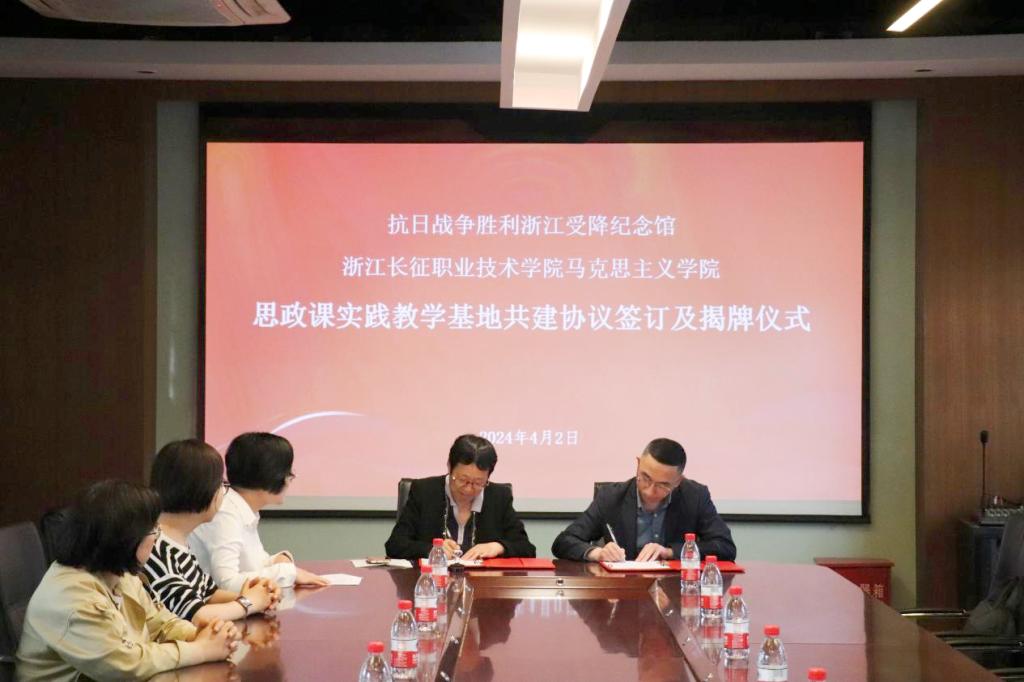 为深入贯彻落实习近平总书记关于“大思政课”建设的重要指示批示精神,构建马克思主义学院“大思政课”工作格局,4月2日,学校马克思主义学院与抗日战争胜利浙江受降纪念馆共建思想政治理论课实践教学基地协议签订及揭牌仪式在抗日战争胜利浙江受降纪念馆举行。富阳区文物保护中心主任章新波、抗日战争胜利浙江受降纪念馆负责人张媛、马克思主义学院院长王华出席了仪式。富阳区文物保护中心、抗日战争胜利浙江受降馆工作人员、马克思主义学院思政课教师和学生代表参加了仪式,仪式由我校习近平新时代中国特色社会主义思想概论教研室主任张红星主持。
