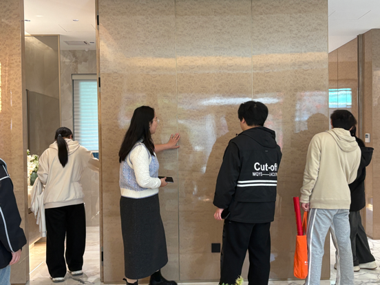 学生通过分析别墅的功能分区、动线规划及采光通风,深入理解“以人为本”的设计逻辑;教师以墙面石材拼贴、木饰面收口工艺、智能灯光系统为例,解析材料特性与施工细节,帮助学生突破理论局限,直观感受设计落地要点。样板房的现代轻奢风格、软装搭配及艺术装置陈列,激发学生从“美学感知”到“创意表达”的思维跃迁,尝试转化灵感。