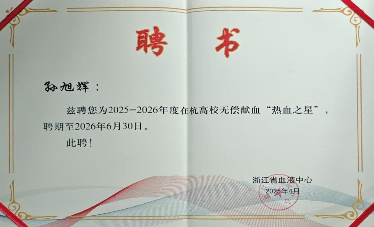 4月22日,由浙江省卫生健康委员会、浙江省教育厅、共青团浙江省委员会、浙江省红十字会、浙江省学生联合会主办的2025年度浙江青年“热血先锋”无偿献血志愿服务主题活动交流会在杭州举行。我校建筑工程学院孙旭辉同学凭借突出表现,荣获2025年在杭高校无偿献血“热血之星”称号,展现了新时代青年学子的责任与担当。