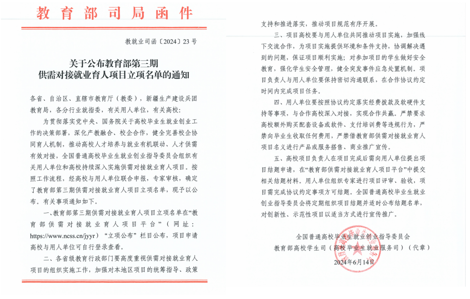近日,教育部发布了第三期供需对接就业育人项目立项名单,我校商务与贸易学院两个项目成功立项。